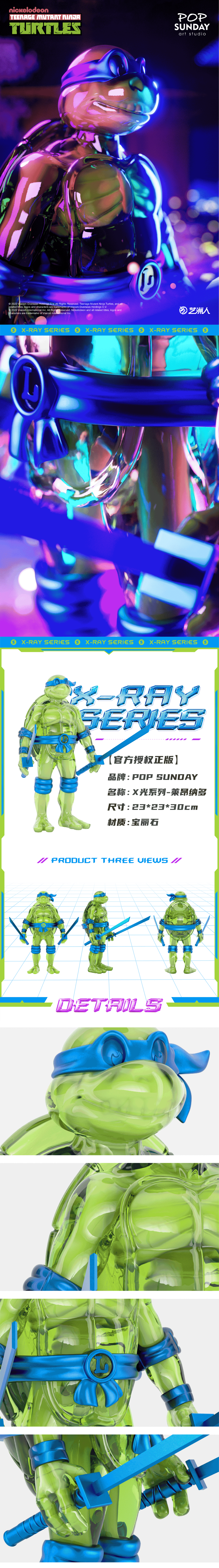 此次POP SUNDAY忍者神龟首弹系列:X光,整体风格以赛博朋克为主,在这种神秘色调的氛围下,给人营造一种介于过去与未来的不真实感。